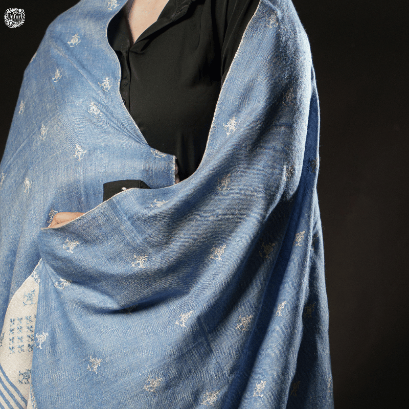 This denim blue Pashmina shawl blooms with delicately embroidered floral motifs, balancing modern charm with traditional artistry. Its deep shade and intricate detailing create an effortlessly sophisticated look. Light, warm, and versatile, it suits both formal gatherings and casual wear. Endorsed with a GI tag of authenticity, it guarantees heritage craftsmanship. 100% pure pashmina, 100% handwoven, this shawl is a luxurious reflection of Kashmiri artistry and timeless beauty.