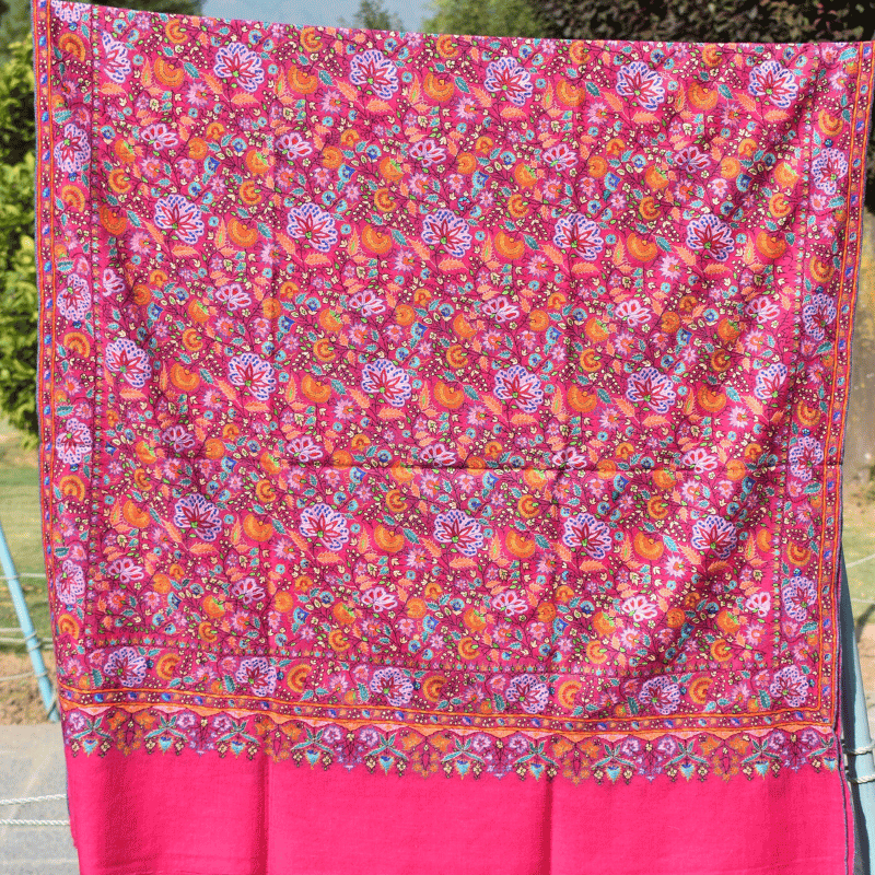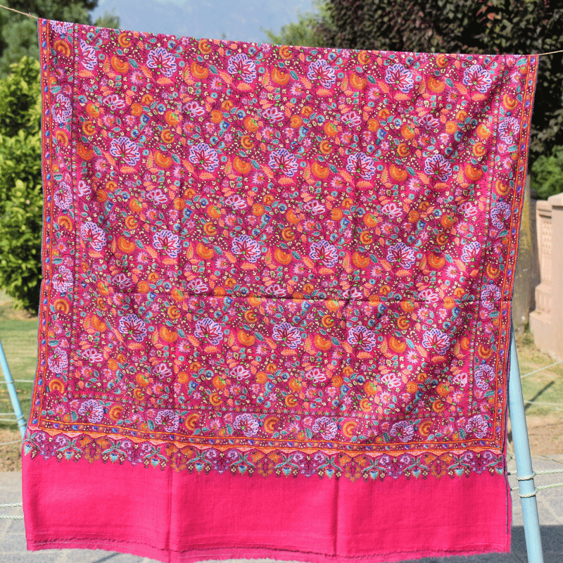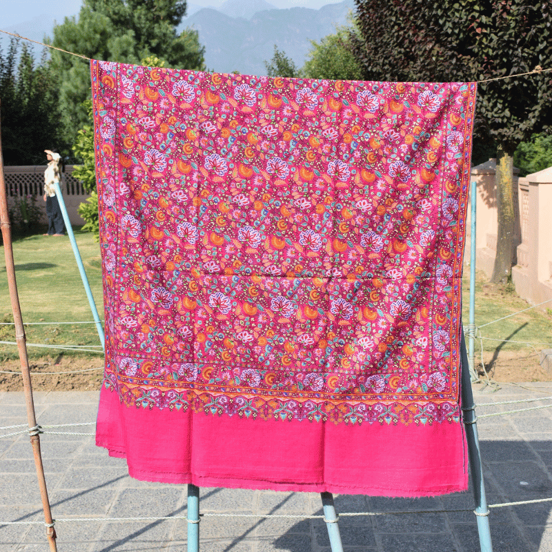 Handcrafted in Kashmir, India. Each piece is woven by master artisans using GI-certified Pashmina/Cashmere. Takes 60-90 days of handwork and precision.