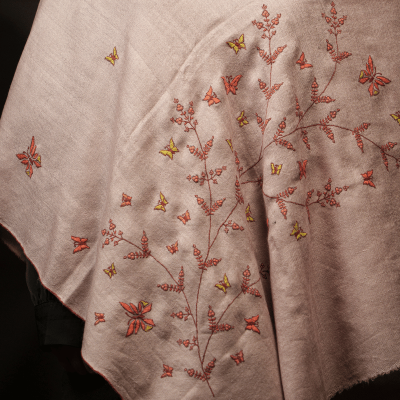 A dreamy mauve base adorned with delicate butterfly and wine-inspired motifs, this Pashmina wrap captures nature’s elegance in its weave. Each detail is hand-embroidered with precision, highlighting the artisanal craftsmanship of Kashmir. Its featherlight texture and timeless charm make it an exquisite piece to style across seasons. This wrap carries the pride of tradition with a GI tag for authenticity. 100% pure pashmina, 100% handwoven, it is a treasured heirloom blending luxury with heritage.