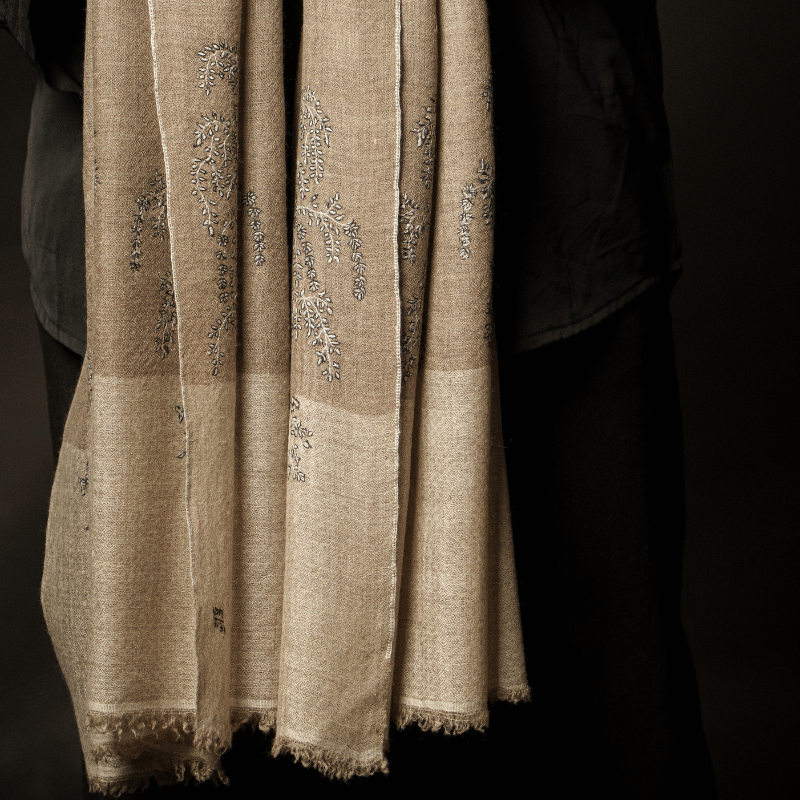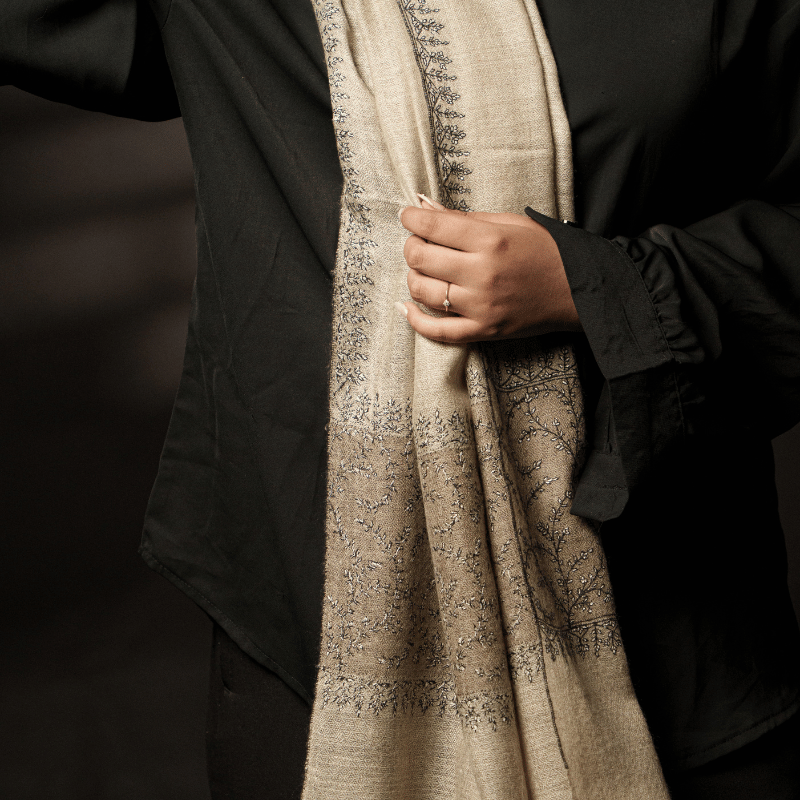 The Natural Brown Pashmina Wrap with an embroidered ivory palla celebrates contrasts in the most graceful way. The earthy brown body is elevated by a delicately embroidered palla, making it a statement piece for refined wardrobes. Soft, warm, and featherlight, it embodies timeless Kashmiri craftsmanship. Highlighting heritage and luxury, it is made from 100% pure pashmina and 100% handwoven artistry. Certified with a GI tag, this wrap is both authentic and enduring, a true heirloom to cherish.