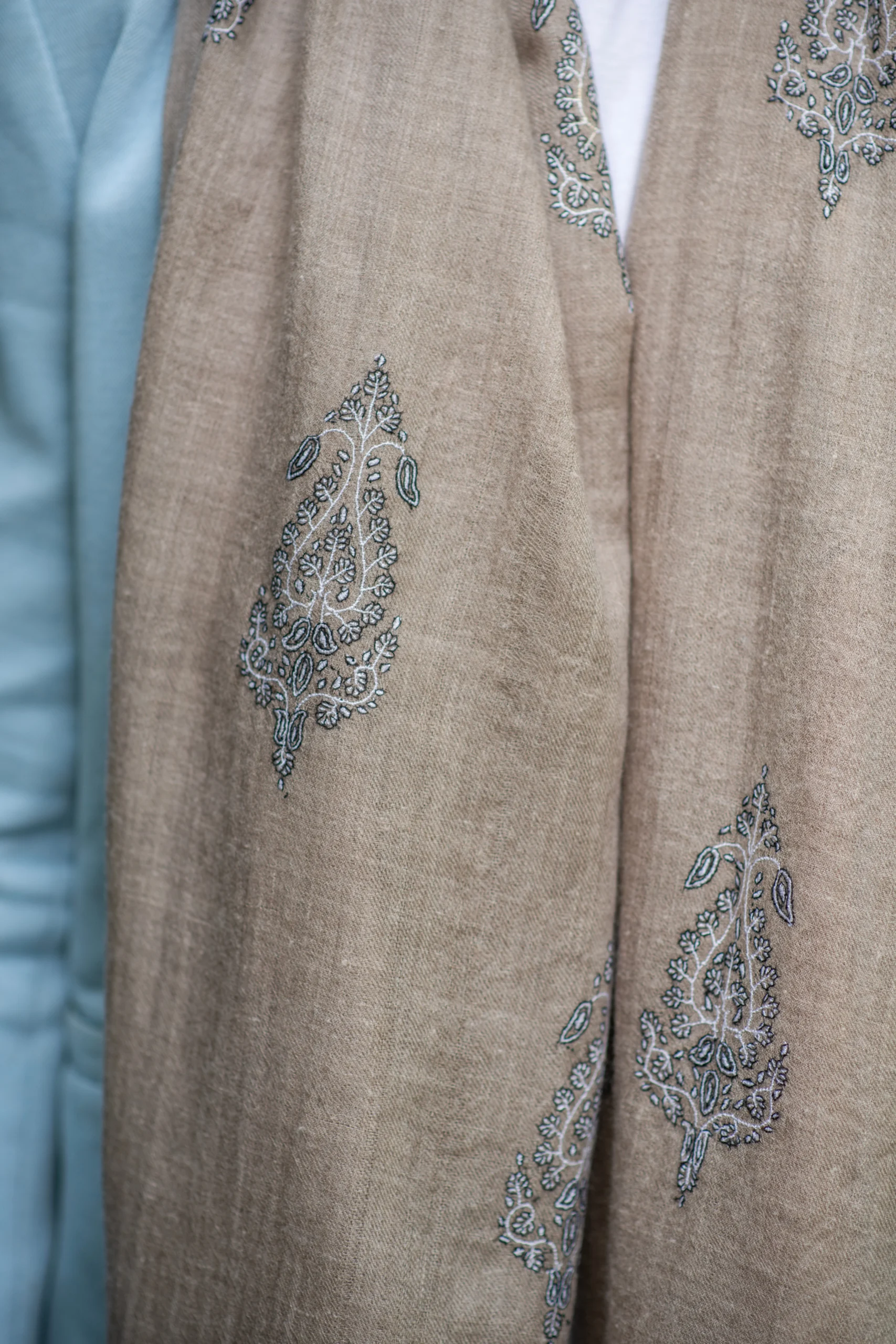 Natural Brown with Embroidered Ivory Palla Pashmina Wrap