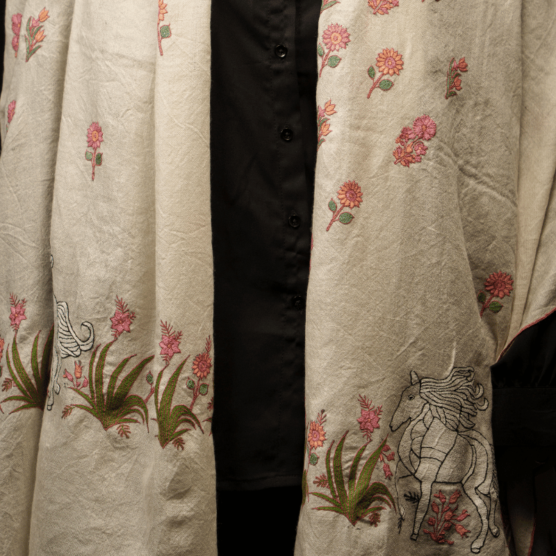 An extraordinary wrap crafted on a pristine off-white base, adorned with a rare unicorn motif, symbolizing purity and imagination. The embroidery brings an enchanting narrative into the timeless softness of Pashmina. Its uniqueness makes it an exclusive treasure for collectors and connoisseurs of fine handwork. With a GI tag of authenticity, it ensures its heritage origin. 100% pure pashmina, 100% handwoven, this wrap embodies both magical artistry and luxurious elegance.