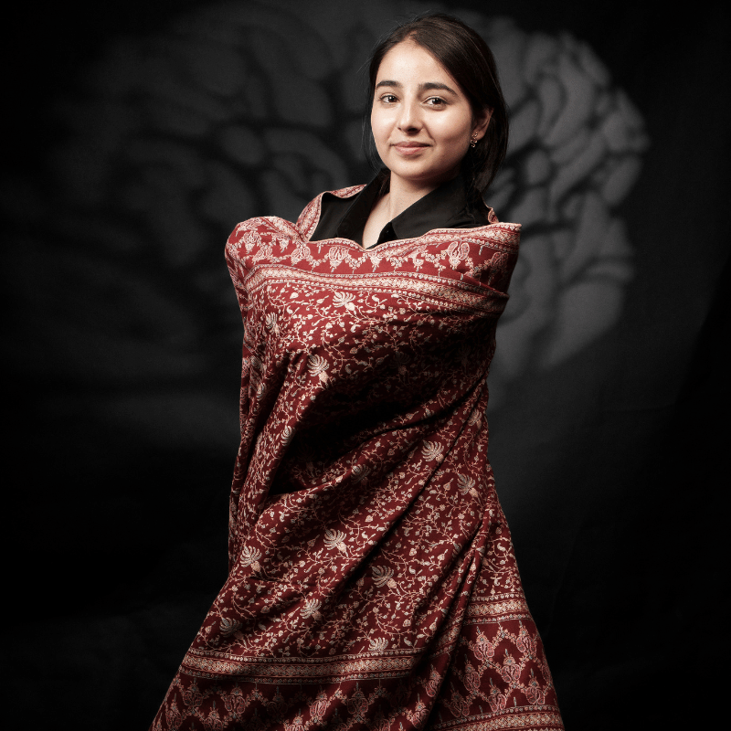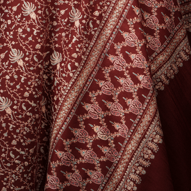 Handcrafted in Kashmir, India. Each piece is woven by master artisans using GI-certified Pashmina/Cashmere. Takes 60-90 days of handwork and precision.