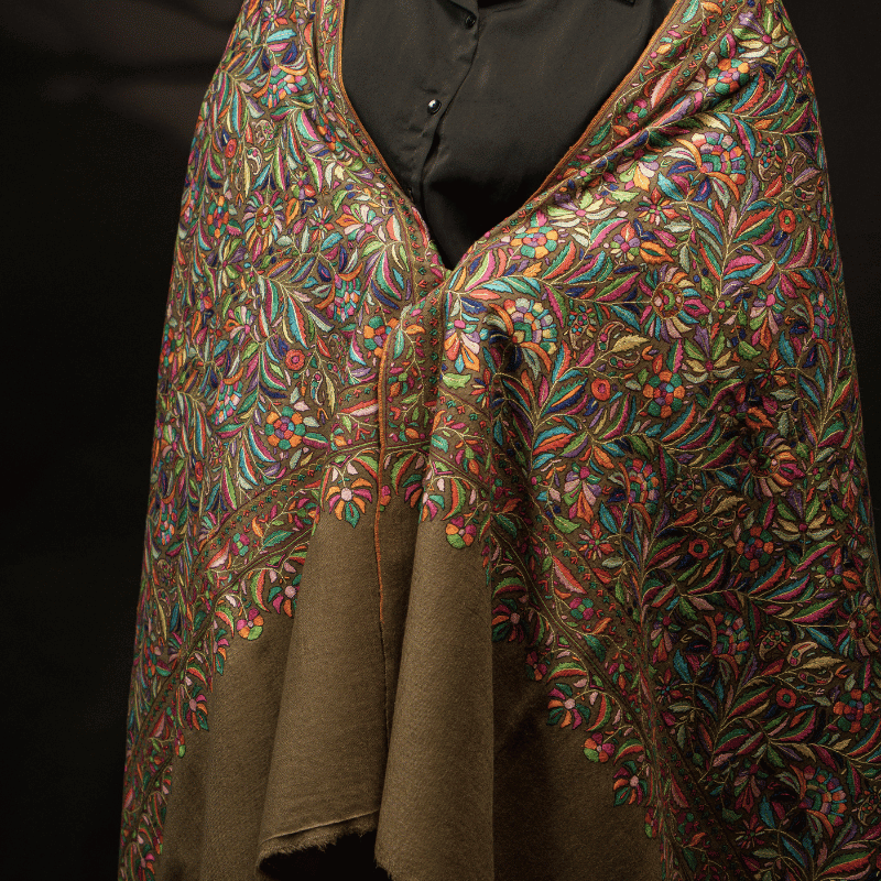 Handcrafted in Kashmir, India. Each piece is woven by master artisans using GI-certified Pashmina/Cashmere. Takes 60-90 days of handwork and precision.